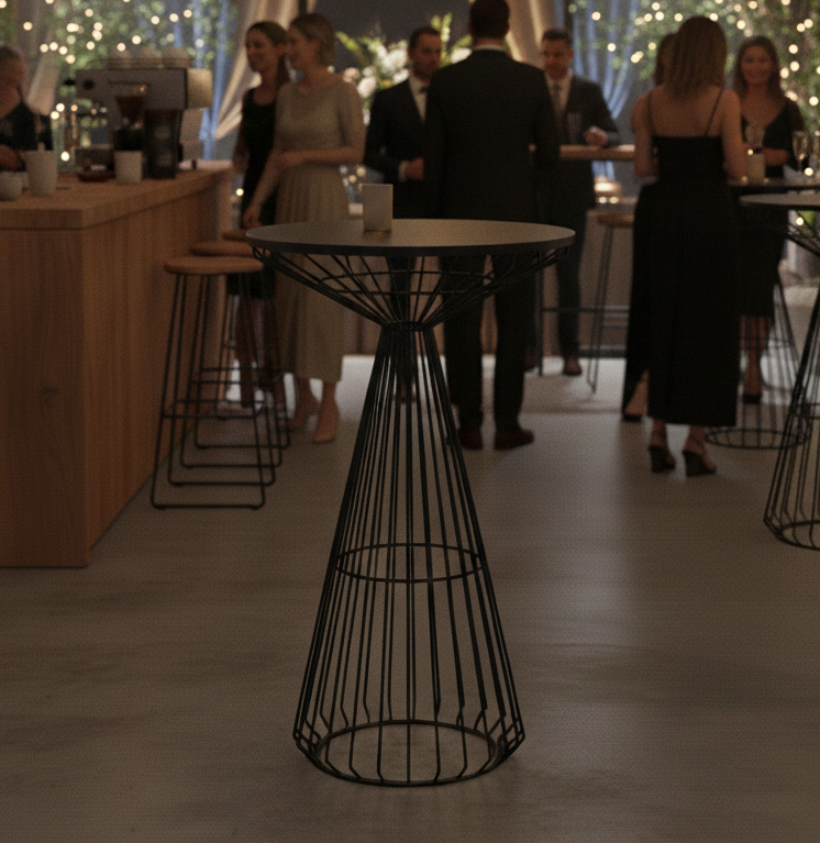 Our Black Hawaiian Cocktail Table, featuring an elegant design, stands 42″ high with a 28″ diameter, perfect for any event.