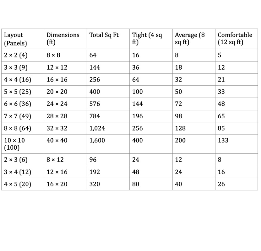 2 × 2 panels (4 panels) — 8′ × 8′ — 64 sq ft → 16 / 8 / 5 (Tight / Avg / Comfortable)