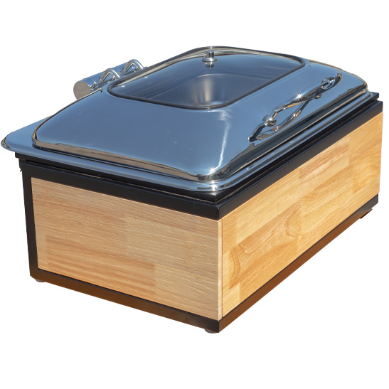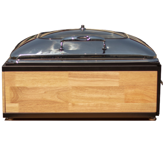 Transform your buffet or catering presentation with the Sierra Chafer — a stunning blend of style, innovation, and practicality. Its sleek, solid black metal frame exudes contemporary sophistication, while the organic wood side panels add warmth and a touch of natural charm. Topping it off is a polished stainless steel lid featuring a self-closing hydraulic hinge, ensuring smooth, silent operation that keeps food warm while minimizing heat loss.