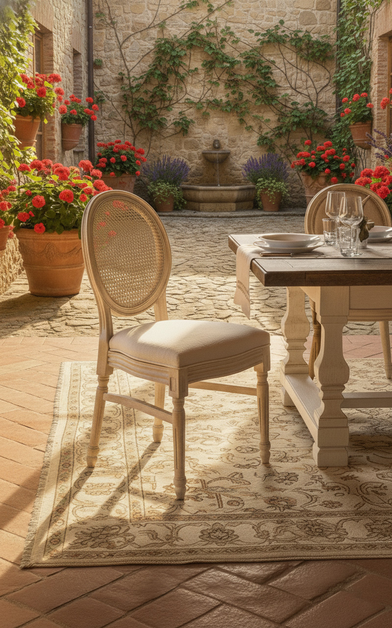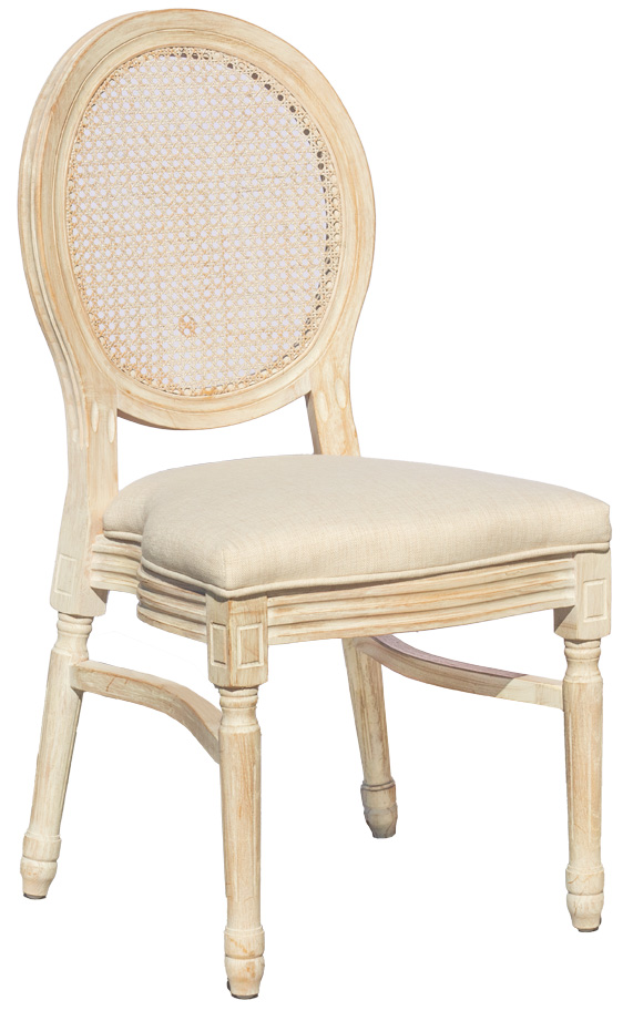 The Tuscany Chair combines rustic elegance with modern comfort. Featuring a rattan backrest and a plush linen seat cushion in a soft stone-wash finish, it brings natural texture and understated sophistication to weddings, events, and stylish gatherings.